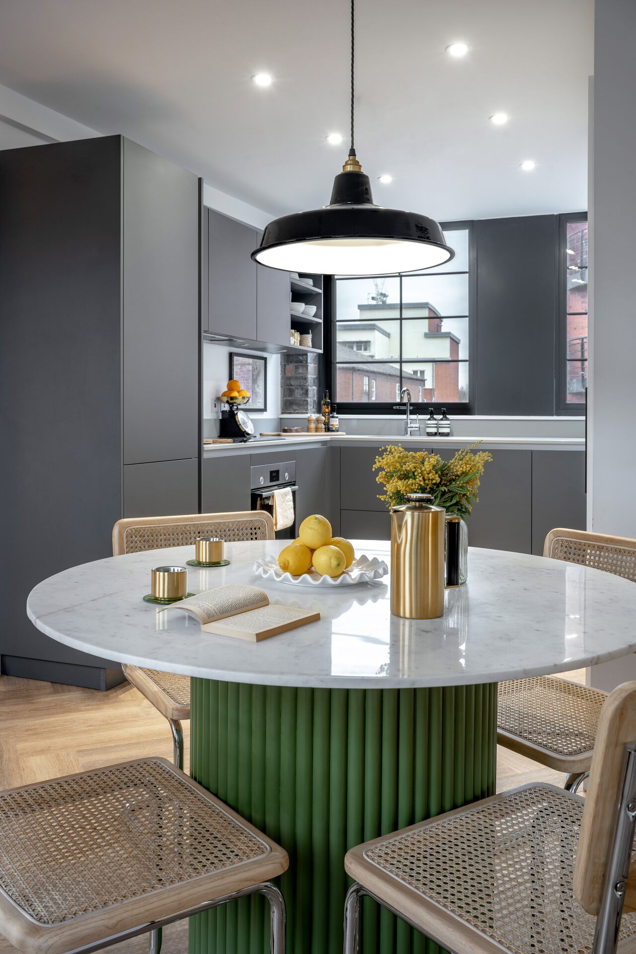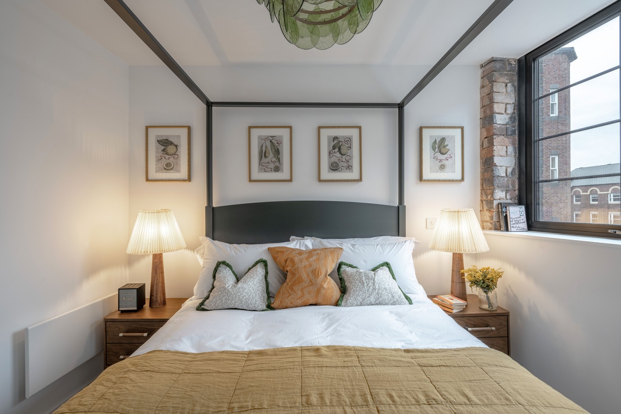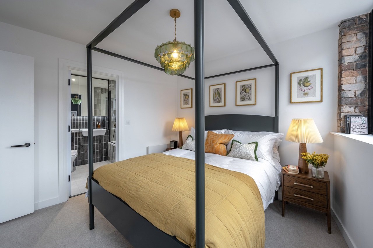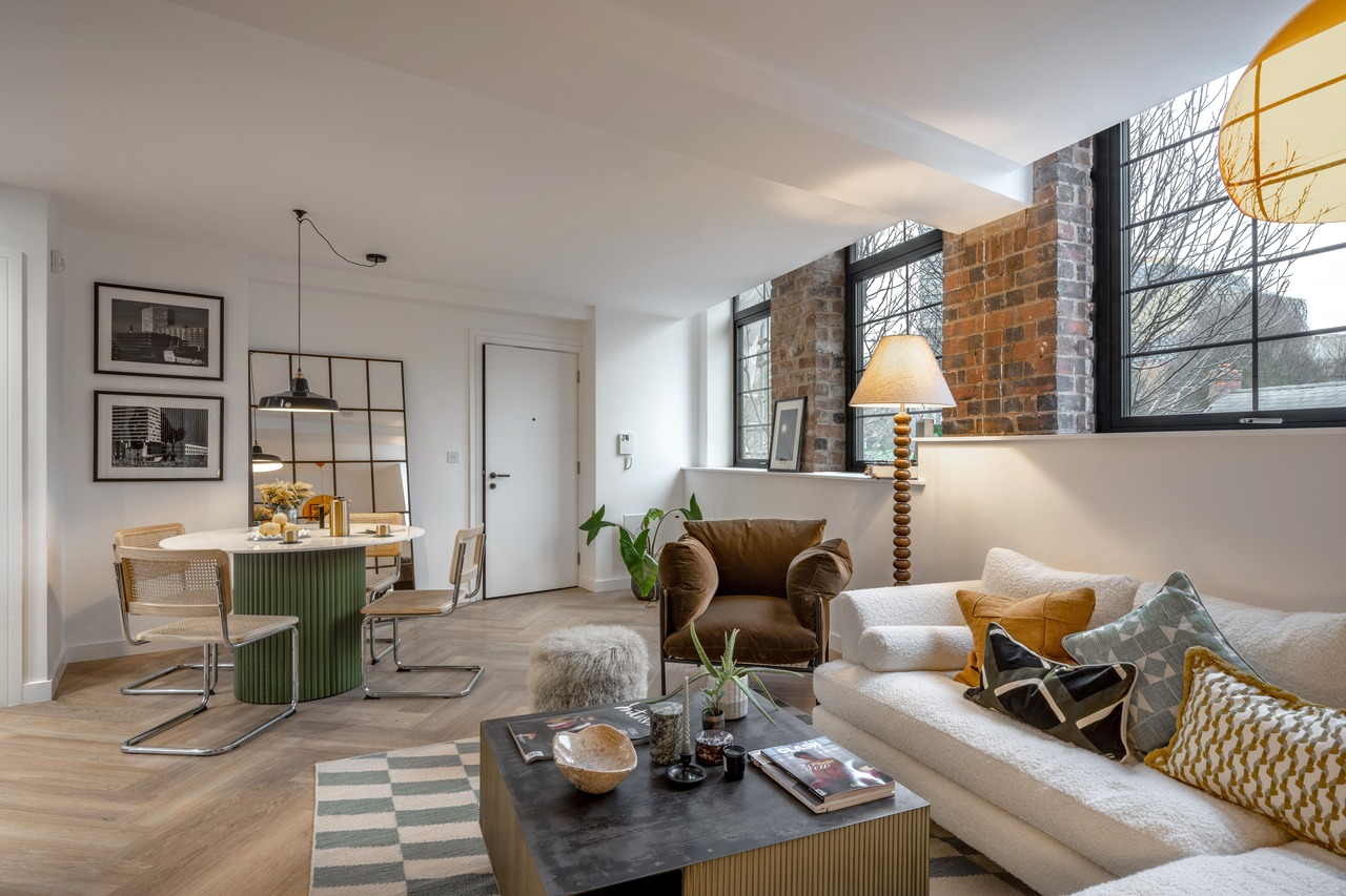 Lockside Wharf has transformed a historic landmark into a collection of 65 bespoke apartments, including one and two bedroom units. Each home features an industrial-chic aesthetic, showcasing original architectural elements such as exposed brick walls, arched windows, and restored fireplaces. These authentic touches are seamlessly integrated with modern luxuries like Poggenpohl kitchens, quartz countertops, and stylish matte black fixtures.